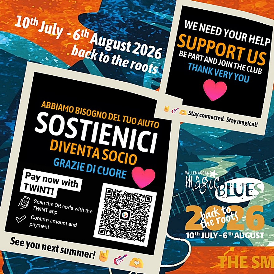 Il contributo può essere versato a favore dell'Associazione Magic Blues, c/o Banca Raiffeisen Losone Pedemonte Vallemaggia, 6673 Maggia, IBAN: CH16 8080 8001 9634 9379 8. Vi preghiamo di indicare nome, cognome e indirizzo completo.